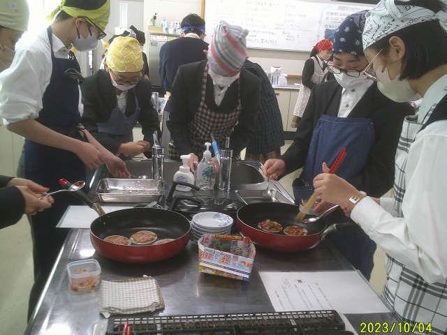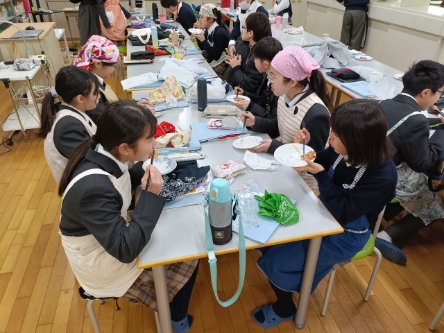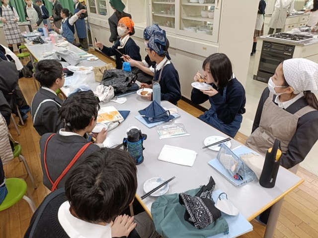 家庭科で調理実習を行いました。餃子の皮ピザです。調理室の使い方を学ぶことを目的に、簡単な料理を作り、調理実習の流れを確認しました。出来上がったピザをみなさん美味しそうにほおばっています。やっぱり自分で作ったご飯は美味しいですね。