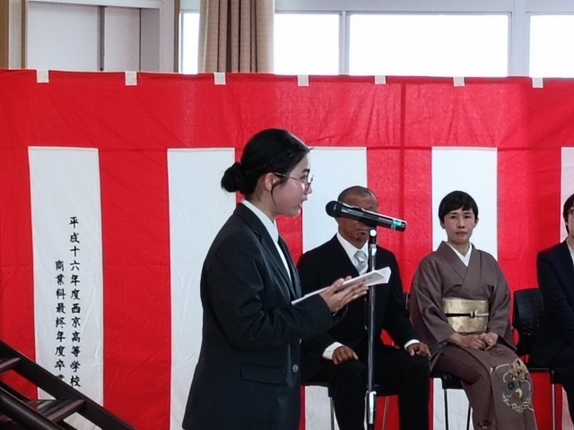 同級生のみんな。私たちは同じ時間を過ごし、同じ景色を見て、それぞれ違う思いを抱えながら今日まで歩いてきました。振り返ってみると、本当に楽しい思い出が、記憶の中から溢れでてきます。EP-Aの無理難題に頭を悩ませた日々、本番まで一生懸命に練習して美しい音色を生み出した音楽発表会、声が枯れるまで応援し、団を越えて盛り上がった西京祭体育の部。その全てがかけがえのないものとして心に残っています。三年間、本当にありがとう。みんなに出会えて、本当に良かった。「おはよう」と言ったら「おはよう」と返してくれるみんな。わからないことがあったら一緒に悩んでくれるみんな。いつも「ありがとう」を忘れないみんな。そんなみんながいてくれたからこそ、今の私たちがあります。四月からは高校生として、それぞれが人生の岐路に立つと思います。そんな時は、みんなと過ごしたこの三年間の思い出を胸に、自分が信じた道を歩んでいきましょう。
