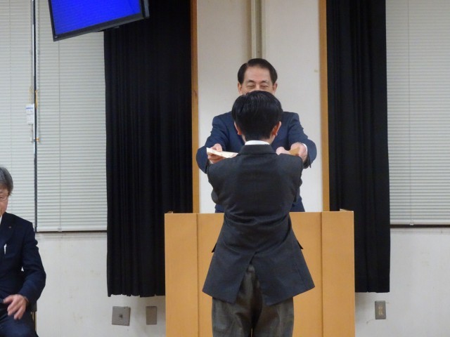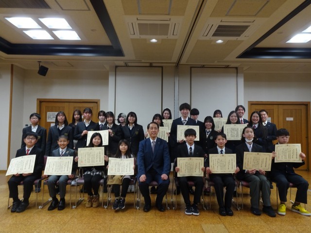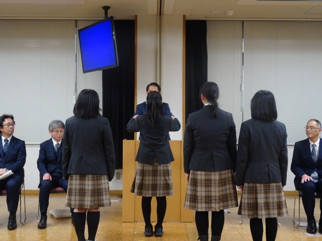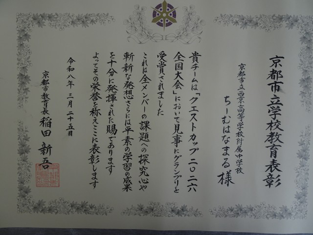 3月25日(水)に京都市総合教育センターにて、令和7年度京都市立学校教育表彰式が行われました。本校からは、気象予報士試験に合格した1年生のK・Nさん、クエストカップ2026全国大会企業探究部門グランプリの「ちーむはなまる」のメンバーが出席しました。京都市教育長より表彰状を頂いたあと、1人ずつ抱負を述べました。