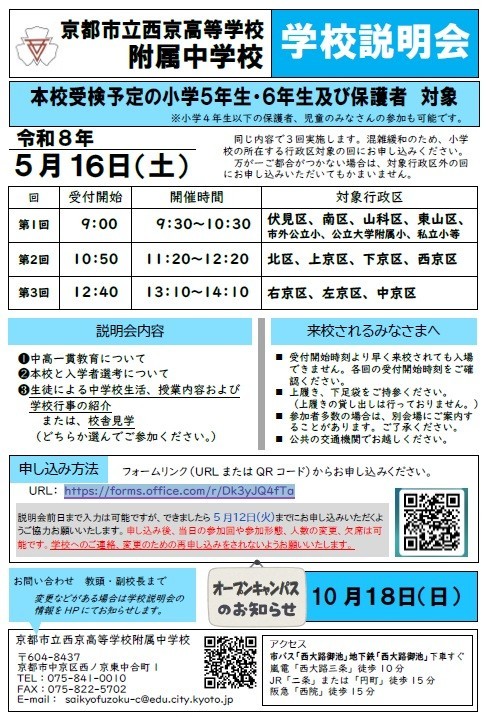 5月16日(土)に令和8年度学校説明会を開催いたします。本校を直接見学いただく機会は5月と10月の年に2回となります。