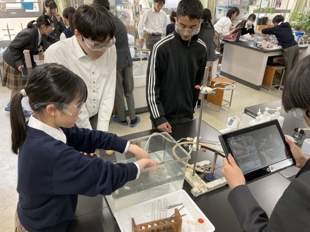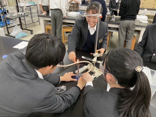 理科では、「どら焼きの生地はなぜふわふわになるのか」という身近な疑問を出発点に学習しました。答えを見つけるため、生地に含まれている炭酸水素ナトリウムを熱し、そのときに起こる変化を実験で調べようとしていました。楽しみながらも、理由をきちんと考えようとする中学2年生らしい姿が印象的でした。