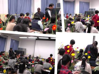 そして,今回は第2弾として 3,4限に池坊の方々に来ていただき,華道体験を行いました。はじめ講師の先生から華道の歴史のビデオを見ながら,いけばなのありかたや自然との調和などについて説明していただきました。