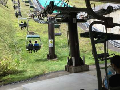 お土産購入の後、予定を変更して白馬ジャンプ台の見学に行きました。リフトに乗って、ジャンプ台の上に行き、ジャンプ台の大きさ、雄大さに感激しながら見学をしていました。