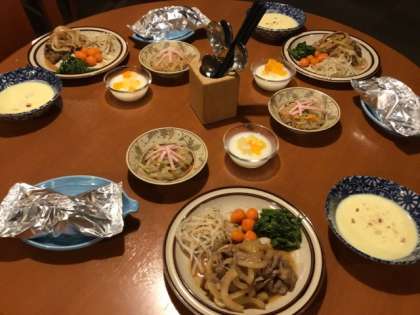 行程の変更でホテルへの到着が30分ほど遅れましたので、夕食も18時30分からとなりました。今日は多くの体験をしたり、見学をしたり、盛りだくさんの内容で、おなかが空いていたのか、みんなもりもり食べていました。