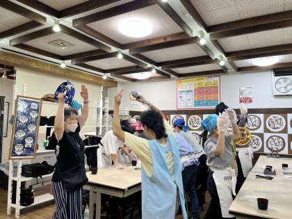 1食目は、でき上がっている生地からうどんを作り、2食目は踊りながら粉からうどんの生地を作りました。スタッフはタンバリンを持って、生徒より汗をかいて踊っています。とても楽しく活動させていただきました。