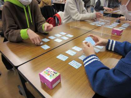 5日3限は全校百人一首大会を行いました。感染対策にも留意したルールを守って、静まった中で読み手の先生の声が響きます。札を並べて最初に暗記タイムがあり、集計までどのテーブルもみんな真剣です。百人一首が得意な人もいれば、覚えている札は絶対取ると集中している人もいて、楽しい空間の中で、いつもと違う表情がみえましたね。