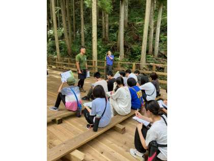 フォレストアドベンチャーでは、美しい祖谷渓谷を目の前に、インストラクターさんのレクチャーのもと、グループに分かれてチームビルディングを行いました。数式や四字熟語、インストラクターさんに関するクイズが用意されており、それらの課題をこなしながら、本格的なアスレチックコースをまわりました。スリルと達成感を味わい、スタート前には怖がっていた人も、最後は360mを越えるのジップラインに挑戦することができました。みんなの絆がより深まったように見えます。