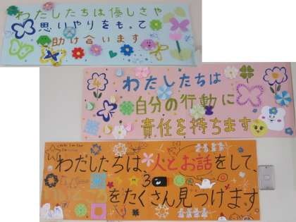 学年目標が掲示されています。「早寝早起きの生活習慣」「絵がもっとうまくなりたい」「広くやわらかく」「自分のやりたいことをみつける」・・・なりたい自分がいろいろでてきました。同じウイングの人は、こんなことを思ってるんだ・・「ふ〜ん」「おもしろいな」「すごい」互いに関心をもってくれるのもいいかなと思っています。
