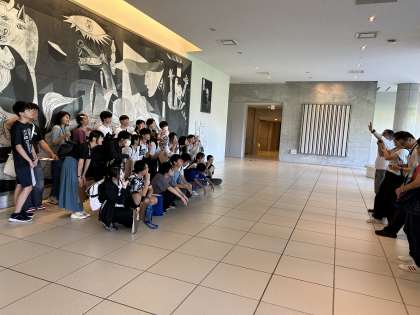 長い長いエスカレーターを登って美術館へ向かいます。昼食後にみんなでゲルニカの前で記念撮影。