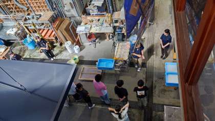 工房で実際の作業を見せてもらうグループと阿波和紙の歴史を映像で学ぶグループ。
