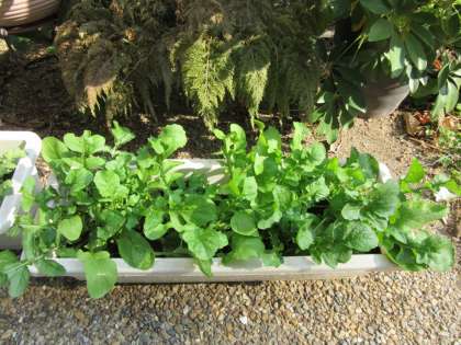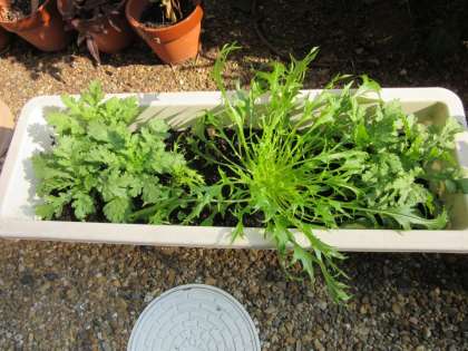 1年生が中京区役所屋上農園でいただいたルッコラ、春菊、水菜。一株ずつだったのが、大きく育っています。プランターに植え替え、生徒やスタッフが水をやり、色鮮やかに育っています。食べられます。