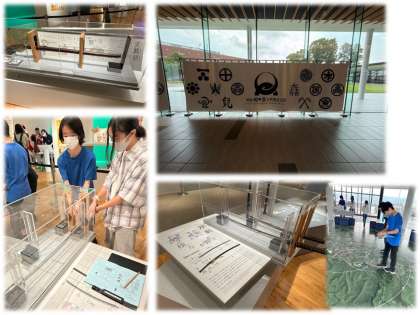 展示室です。とても興味津々に銃を持ったりしています。刀って、こんなに重いんですね…。こんな物を持って何時間も戦をするなんて、考えただけでしんどいです…。床が陣形図になっていたり、クイズラリーをたどるようになっていたり、楽しい工夫が満載です。