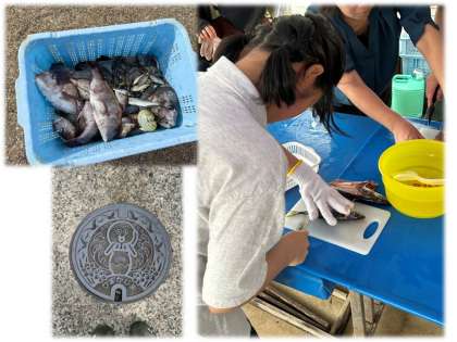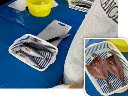 地引網のあとは、アジの干物作引きり体験です。多くの人にとって、魚を開くのは初めての体験だと思います。上手にできるかな?教えていただきながら3尾のアジを開いていきます。