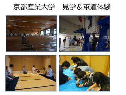 9日水曜日には、京都産業大学・茶道部の方々にお世話になり、大学の教室や天文台を案内してもらったり、学食で昼食をいただいたりして、大学生生活の一部を体験しました。そして、茶道部の手ほどきにより、茶の湯を体験しました。