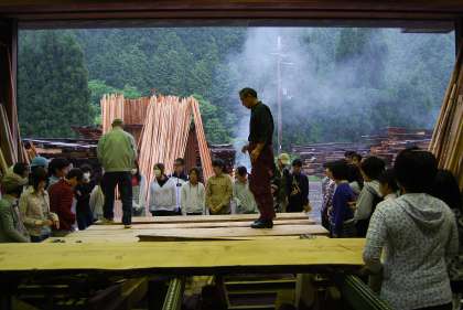 4日は快晴に恵まれ、花背の新緑の中でうどん打ちと野外炊飯に取り組みました。前日に自分たちでつくった竹の器とヒノキのお箸で食べた手打ちうどんは本場の讃岐うどんをしのぐおいしさでした。