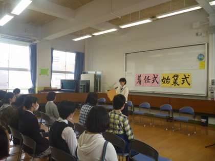 グラウンドの初音桜も満開になり、穏やかな風が吹く中、着任式・始業式が行われました。今年度より教頭先生、科学の時間の社会担当、数学担当、英語担当、そして学校の事務の先生、5名の方が着任されました。皆さんから一言づついただいた後、生徒の歓迎の言葉で迎えました。