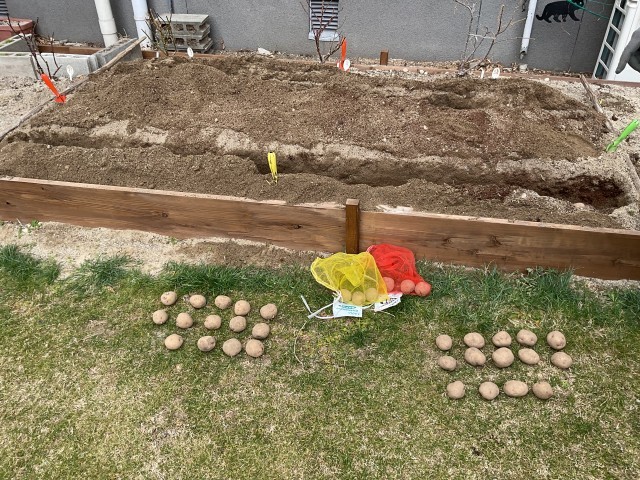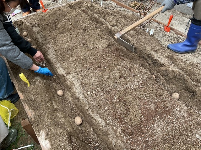 20日、今年度最後の係活動です。生き物係は、「風の庭」にじゃがいもを植えます。キタアカリ、男爵。肥料をいれ準備をしてもらったところに、約30個の種芋も半分ずつ植えました。