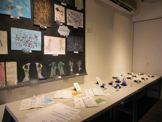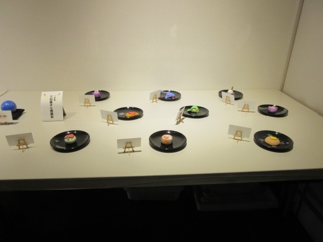 3年生のランプシェードには、今年タイトルが添えられています。タイトルと作品を見比べてみるとなるほどと感じつつ、作者の生徒の顔が浮かんできます。2年生の和菓子、1年生の泥だんご、今年は消しゴムはんこの作品もおもしろいですね。壁面の選択美術の作品は、二度と同じものはつくれないそうです。