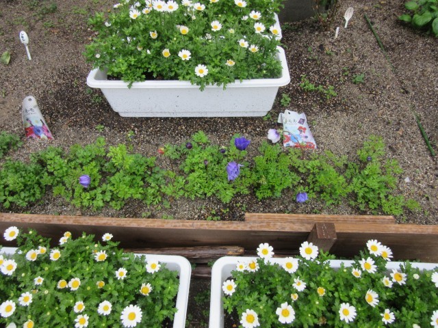 アネモネもかわいい小さな花を咲かせています。アネモネとチューリップのあいだにあるじゃがいもも育っていますよ。