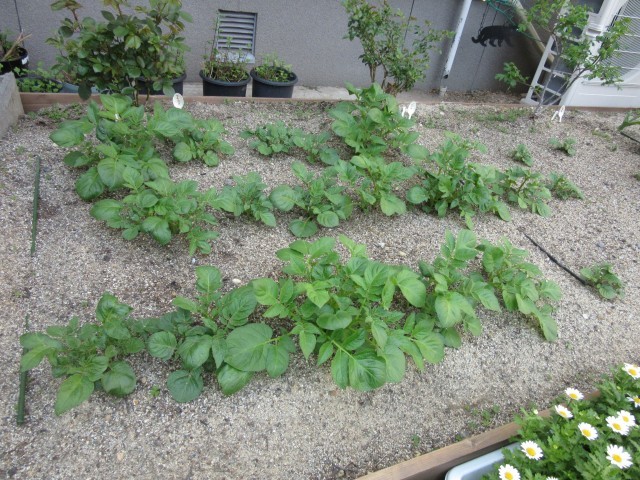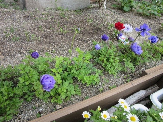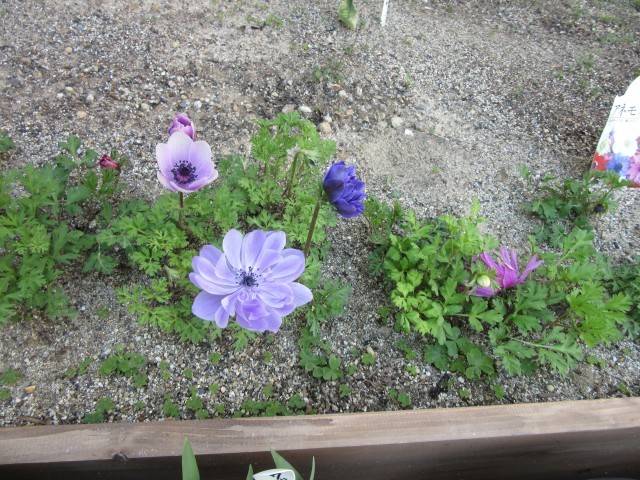 アネモネは小さくかわいい花と思っています。その色は、近づいてみると、離れて見るときと違うなんともいえない美しさがあって、しばらくじっと見てしまいました。となりはじゃがいもです。じゃがいもも2種類あります。