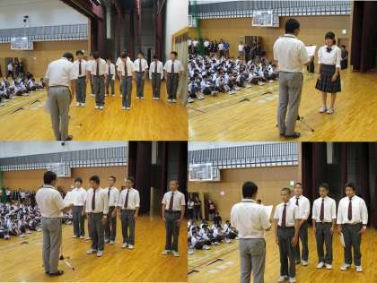 最初に全校表彰があり,1組合同球技大会のバレーボールの部優勝,卓球女子個人の部,柔道男子団体,柔道男子個人の部,柔道女子個人の部の表彰を行いました。健闘おめでとうございます。あと一月足らずで夏季大会が始まります。3年生にとっては最後の大会です。コンディションを整え,精一杯の活躍をして欲しいものです。