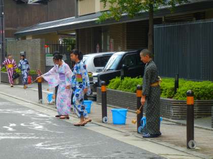 7月14日、下京中恒例行事の「ゆかた登校」が行われました。1年生にとっては初めてのことでしたが、先日の「着付け教室」で学んだことを生かし、自分でゆかたを着ている生徒もいました。朝には、環境委員による「打ち水大作戦」も行われ、暑い中にも涼を呼ぼうという取り組みも行われました。