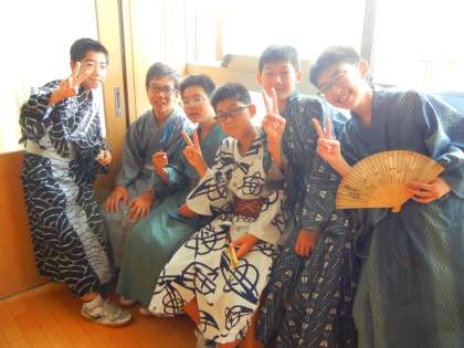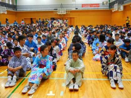 最初の全校集会では、校長先生をはじめ地域の方々からのお話を聞き、最後に全校でゆかた姿の写真を撮りました。