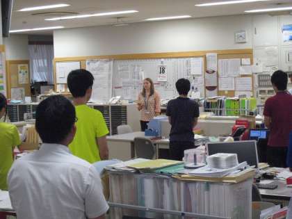 本校に,3年間勤務していただいた,ALTのロファー カーリー先生が本日をもって,転勤することとなりました。小中一貫英語教育にもご尽力いただき,下京中学校ブロック小学校・中学校教職員はもちろんのこと,児童・生徒からも大変好かれ,いつも笑顔で接していただき小中学校ともに楽しい英語授業や英語部の活動が行われていました。英語が好きになった子どもたちも多くいたことと思います。