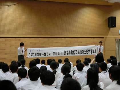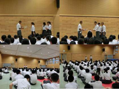 本日4時間目、3年生の学年集会が行われました。最初に、3年生の人気コンビ『ベーコンレタスバーガー』の抱腹絶倒、空前絶後の漫才で雰囲気を盛り上げました。続いて1組から順に、各クラスのクラス自慢を行い、クラスの絆や仲の良さをアピールしました。そして残りの中学校生活半年間も精一杯、頑張っていくぞ!という思いを込めた学年目標「この3年間は一生モノ!羽ばたけ!最幸で最協で最後の三田村学年!」を発表しました。そして坂田先生から夏休みの生活面の注意、東上先生から夏休み中のオープンスクール等、進路の話、最後に学年主任の三田村先生のありがた〜い話で締めくくりました。