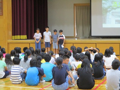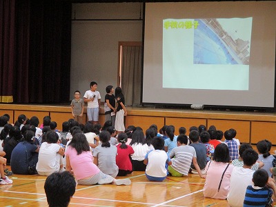 小中交流会の中での,各小学校紹介の一場面です。写真は洛央小学校と下京涉成小学校の紹介です。