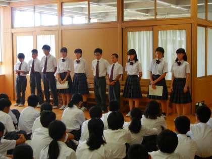 まず、学校祭に向けて、「クラスみんなでしっかり練習して、合唱コンクールで金賞をめざします」「クラス団結して体育の部優勝を勝ち取ります」といった各クラスの意気込みを代表委員が発表してくれました。