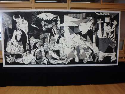 今年の展示制作テーマは平和。ピカソの作品「ゲルニカ」をドットアートで創り上げました。ピカソが「ゲルニカ」を描いた背景を知り、一人一人思いを込めました。