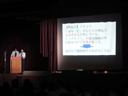 探究学習の発表では、学年全体から選抜された数名が協力者の寸劇とともに、笑いも交えながら、「虫が絶滅したらどうなるのか」「機動戦士シリーズが愛される理由」を発表しました。各々が役割を果たし、素晴らしい発表となりました。