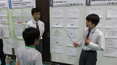 10月7日,堀川高校本能館で,小・中・高等・支援学校児童・生徒ポスター発表会が行われました。下京中学校からは7グループ12名が参加しました。それぞれの個人やグループが調べた結果をポスター形式に張りだした資料を提示しながら,聞き手に対して,わかりやすく説明をしていました。又聞き手からの質問に対しても,丁寧に熱心に回答をしていました。