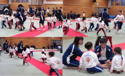 今日は光林保育園5歳児クラスと3年5組の生徒が交流しました。元気いっぱい走り回る園児に中学生も息を切らせて交流していました。