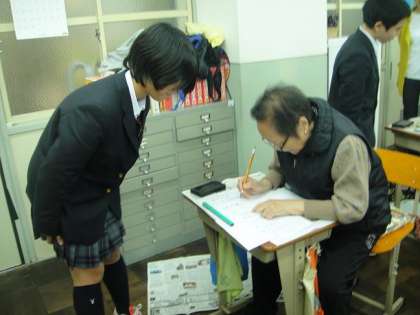 現在、京都市立洛友中学校には46名の方が在籍していらっしゃいます。平均年齢は、64.1歳だそうです。見学させていただいたこの日は、四則計算や毛筆を使った字の練習、英単語の練習などに真剣に取り組んでいらっしゃいました。大人の中学生から質問を受ける生徒達は、とても緊張した表情でしたが、身をかがめ一生懸命答える姿はとてもほほえましいものでした。そして、学習する様子を見学して、字が書けることや計算ができること、そしてなにより学ぶことの大切さを実感した交流学習会でした。