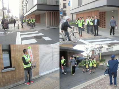 13日登校時、生活委員や野球部の生徒達が『自転車安全推進運動』に取り組みました。下京署の方から講習を受け、通学路の要所要所に生徒たちが立ち、自転車の左側通行、一時停止の励行、イヤホンを聞きながらの通行等の危険行為のないよう、登校してきた生徒はもちろん、一般の通行の方々にも呼びかけました。下京署の方だけでなく、京都府警、地域のボランティアの方々にもご参加いただきました。