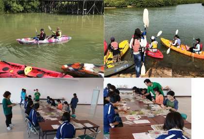 写真はミーバイ釣りに向けての出航風景,バナナボート,マングローブカヌー,紅型染めと髪梳き体験の様子です。とても楽しそうです。