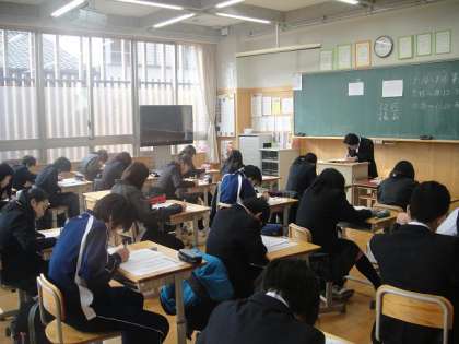 本校英語科教員が中心に指導に当たり、受検する級にそれぞれ分かれて、対策問題に取り組みました。リスニングのテープに耳を傾ける生徒や問題集の問題を解く生徒、教員の解説に真剣に聞き入る生徒と、休日返上で真剣に取り組んでいました。