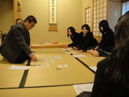 真剣に説明に聞き入る生徒たちに、丁寧にやさしく指導していただきました。初めて参加するかるた大会に、生徒からの質問にも丁寧に答えていただきました。和歌を覚えるために、早速カード作りに取りかかり、意欲満々の伝統文化部でした。