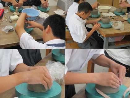 昨日の2組,3組に引き続き,今日は4組,5組,6組が交流の1組の生徒も含めて陶芸教室を行っています。今日も「アトリエY」から来て頂いた講師の方の指導の下,熱心に茶碗の作成を行っています。秋以降の涉成園での茶道体験が楽しみです。