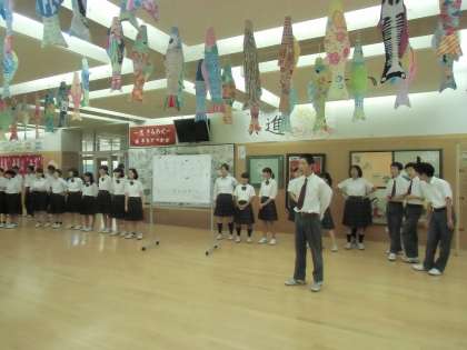 今朝から毎月末、各委員会のメンバーが登校時に『おはようweek』に取り組みます。『いつでも どこでも 誰とでも 笑顔で 目を見て 自分から』というキャッチフレーズのもと、各委員会のメンバーが大きな声で挨拶をしてくれています。今日は代表委員会の面々です。