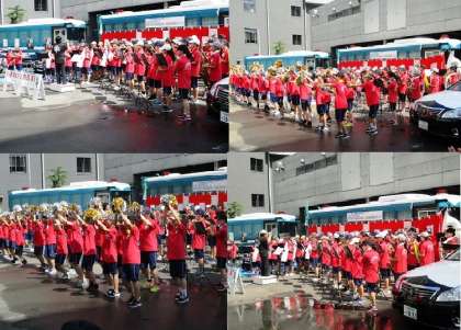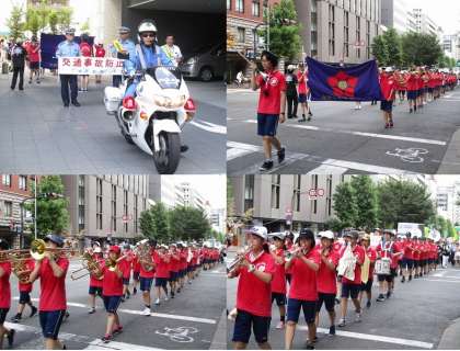 夏の交通事故防止府民運動スタート式に,吹奏楽部が演奏で参加し,その後,パレードも行いました。今日も38.6度の猛暑の中でしたが,下京警察署中庭での演奏の後,烏丸通りをパレードしました。警察車両と白バイの先導で,下京署から四条烏丸までマーチングしました。沿道の人,観光客,等からも拍手で迎えられ,華やかな行進でした。