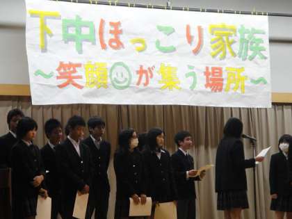『下中ほっこり家族〜笑顔が集う場所〜』《写真・左端》と命名された生徒集会。31日(月)7限に、生徒会役員の手で企画・進行した集会でした。