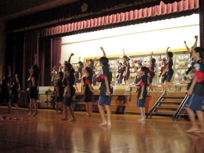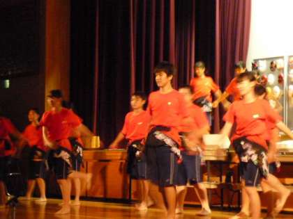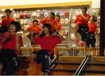 2年生の学年発表 演舞「京炎そでふれ」の様子です。大学生の指導を受け、迫力ある熱演を披露してくれました。全員が作ったお面「和」も,とても効果的でした。