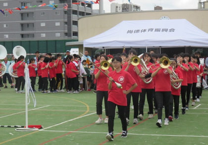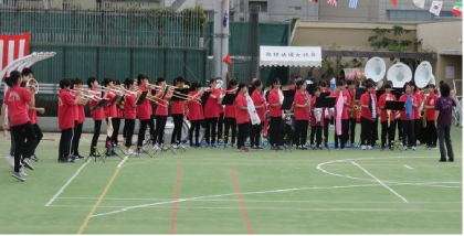 10月7日(日)秋晴れの下、下京中学校の各校区では、区民運動会が開催されました。下京中学校の屋上グランドでは地元の尚徳学区の第61回尚徳学区民体育祭が行われ、開会式に吹奏楽部が参加しました。入場行進のマーチングに引き続き、競技前に演奏を披露しました。吹奏楽部の皆さん、早朝よりお疲れ様でした。素晴らしい開会式になりました。