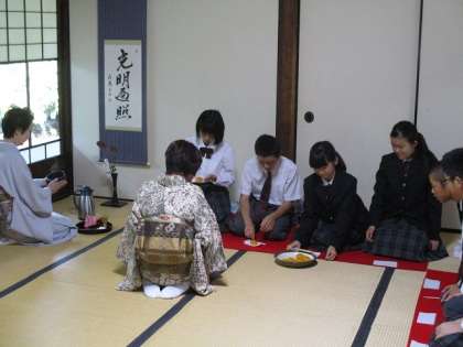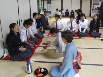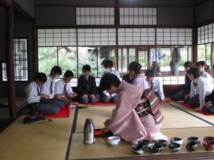 1年生は午前と午後に分かれて,本願寺の飛地境内である渉成園(枳殻邸)で,茶道体験を実施しました。下京区地域女性連合会の皆様の指導の下,閬風亭(ろうふうてい),臨池亭,滴翠軒に別れ,茶道を体験しました。茶碗は夏休み前に,自分で土をこねて作った焼き物です。なれない所作などに苦労しながらも,日本の伝統文化に触れた一時でした。