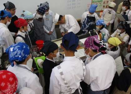 「島原乙文」「井傳」「佐野家」「近定」から来ていただいた講師の方の指導の下,生徒たちは和食の調理に取り組みました。メニューは「鯖の佑庵焼」「お揚げと水菜のひたひた煮」「ハモと松茸のお吸い物」でした。なれない包丁さばきでしたが,一生懸命に取り組んでいました。是非ともご家庭でもご一緒に料理をお楽しみください。