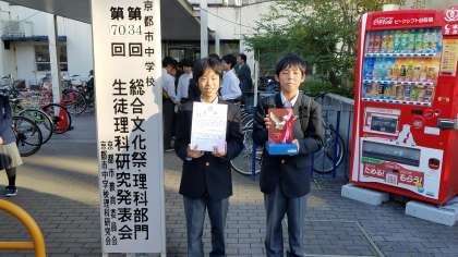 先週から今週にわたって、京都市全域で文化的な取り組みが一堂に会する「中学校総合文化祭」が実施されています。その理科の部門である「生徒理科研究発表会」で本校の1年生が2名、夏休みに行った自然研究の取り組みについて発表してくれました。その結果、1名は優良賞を、もう1名は優秀賞を獲得することができました。当日は保護者の方々も応援に来ていただき、他の学校との交流会も実施されるなど、たいへん盛況な発表会となりました。