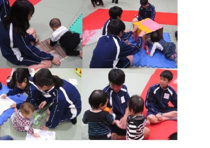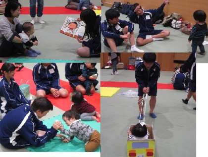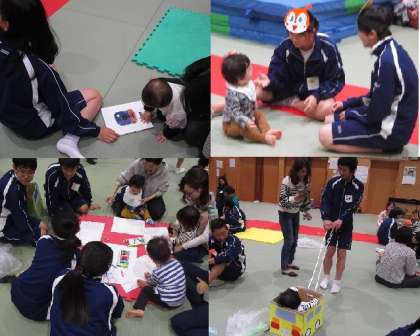 今日は3年8組の生徒が,修徳児童館の1・2歳児をお迎えして実習を行いました。事前に用意した遊びやおもちゃで一時を過ごしました。今日は1・2歳児と言うことで,最初のうちは少し戸惑いもあったようですが,乳幼児の皆さんも保護者の皆さんもとても喜んでもらえました。手作りおもちゃもとても感謝されていました。